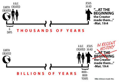 In Matthew 19 and Mark 10, Jesus refers to the existence of humans as occurring “from the beginning” (NASB, ESV, NLT, NET), “at the beginning” (CEB, KJV, NKJV, NIV), or “in the beginning” (CEV, NCV, HCSB, GNT). The context is a discussion about divorce whereby Jesus outlines God’s intent for marriage. This statement has been used to support the validity of heterosexual marriage, but the point in this discussion is that Jesus quite clearly places the creation of man and woman at the beginning of the creation of the world. This statement only makes sense in light of a relatively young earth since Jesus, describing an event that occurred on day 6 of creation, is speaking of it several thousand years later. An occurrence in the first week out of 208,000 weeks (52 weeks x 4,000 years) would certainly be considered in/at/from the beginning of those days by anyone’s reckoning. If Jesus knew there were billions of years preceding Adam and Eve, He would actually be talking about relatively recent history. In that case, He certainly wouldn’t have used “beginning” as a reference point.